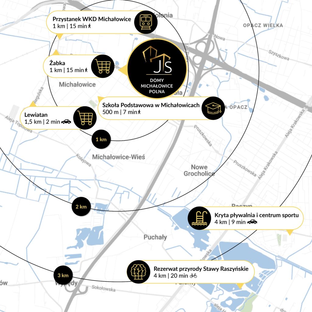 Domy Michałowice Polna to idealne miejsce, by zwolnić tempo i poczuć się jak u siebie. Z dala od zgiełku, ale z pełnym dostępem do miejskich udogodnień. W okolicy znajdziesz liczne sklepy, szkołę, przedszkole, basen, przychodnię, klub sportowy, a nawet restaurację czy kino. Chcesz spędzić czas aktywnie? Wskocz na rower i ruszaj ścieżkami przez rezerwat przyrody. A gdy wrócisz do domu, w ogrodzie czeka Cię popołudniowa kawa w ciszy oraz śpiew ptaków zamiast klaksonów samochodów.